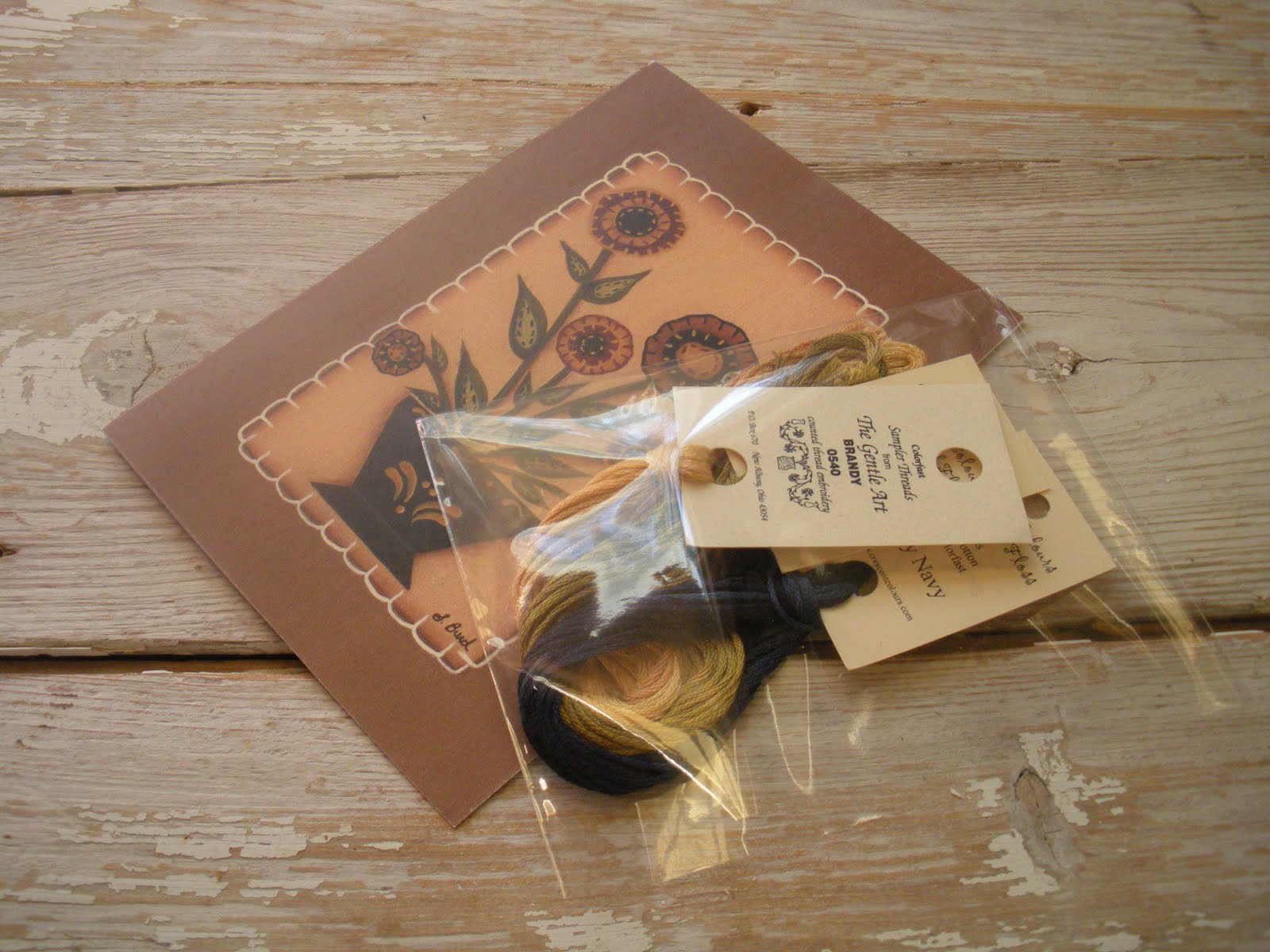 My sweet, sweet friend Lynn sent me this little care package of flosses. Two are Crescent Colours which I don't normally stitch with and don't really have a stash of. Of course now I need to start one. She also sent a skein of Gentle Arts Brandy. I already have a skein (or two) of that thread but the one she sent me is a completely different shade. That's one of the things I adore about hand dyed threads: no two dye lots are identical. It was such a sweet and unexpected little surprise. Thank you, Lynn!